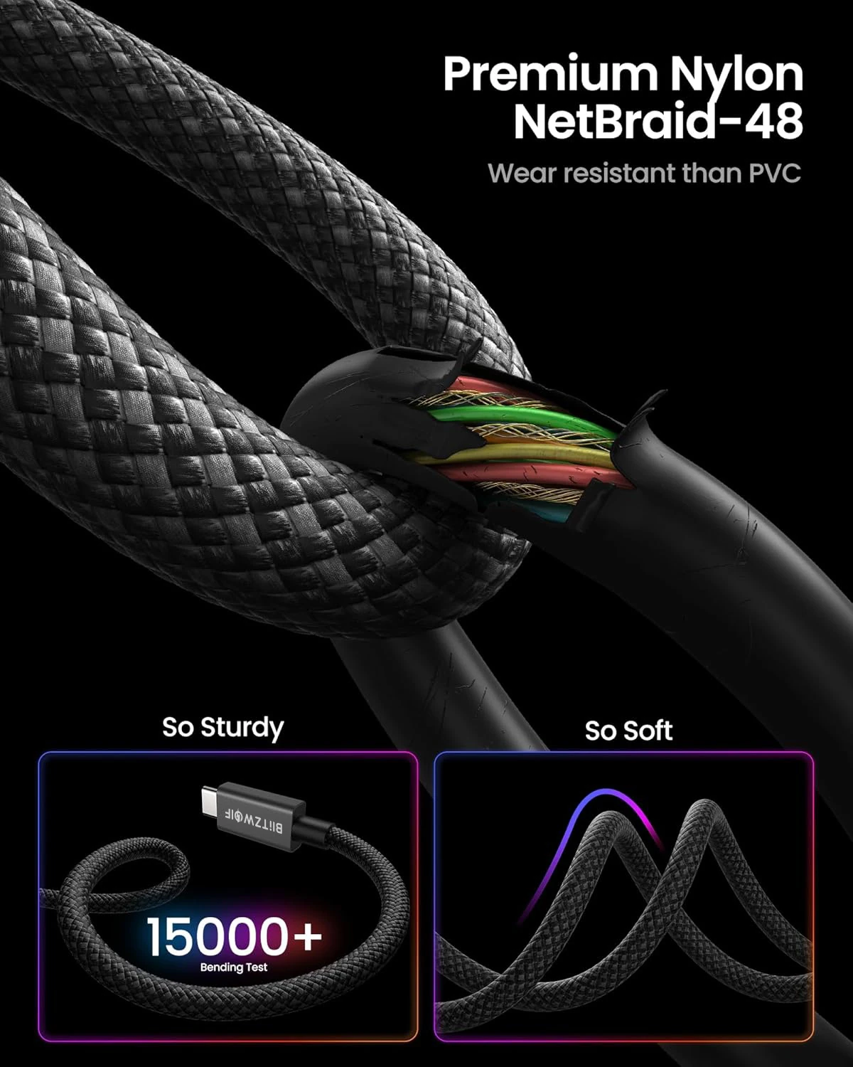Das BlitzWolf® BW-HDC8 ist nicht nur schnell und leistungsstark, sondern auch langlebig. Das Kabel ist durch eine hochwertige Kevlar-Faserummantelung geschützt und hält so dem täglichen Gebrauch stand. Dieses Material in Militärqualität macht es extrem widerstandsfähig gegen Abrieb, Reißen und Verheddern. Wir haben die Stecker mit einem bruchfesten Design verstärkt und sie über 15.000 Biegezyklen getestet, um eine lange Lebensdauer zu gewährleisten. Dieses Kabel ist knickfest und funktioniert jahrelang zuverlässig.
