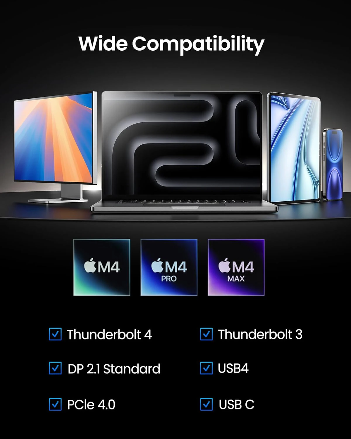 Schließen Sie fast alles problemlos an. Das Kabel ist mit den neuesten USB 4-, USB-C-, DisplayPort 2.1- und PCIe 4.0-Standards kompatibel und bietet Ihnen so die Flexibilität, es mit externen Laufwerken, Displays, Grafik-Docks und mehr zu verwenden.