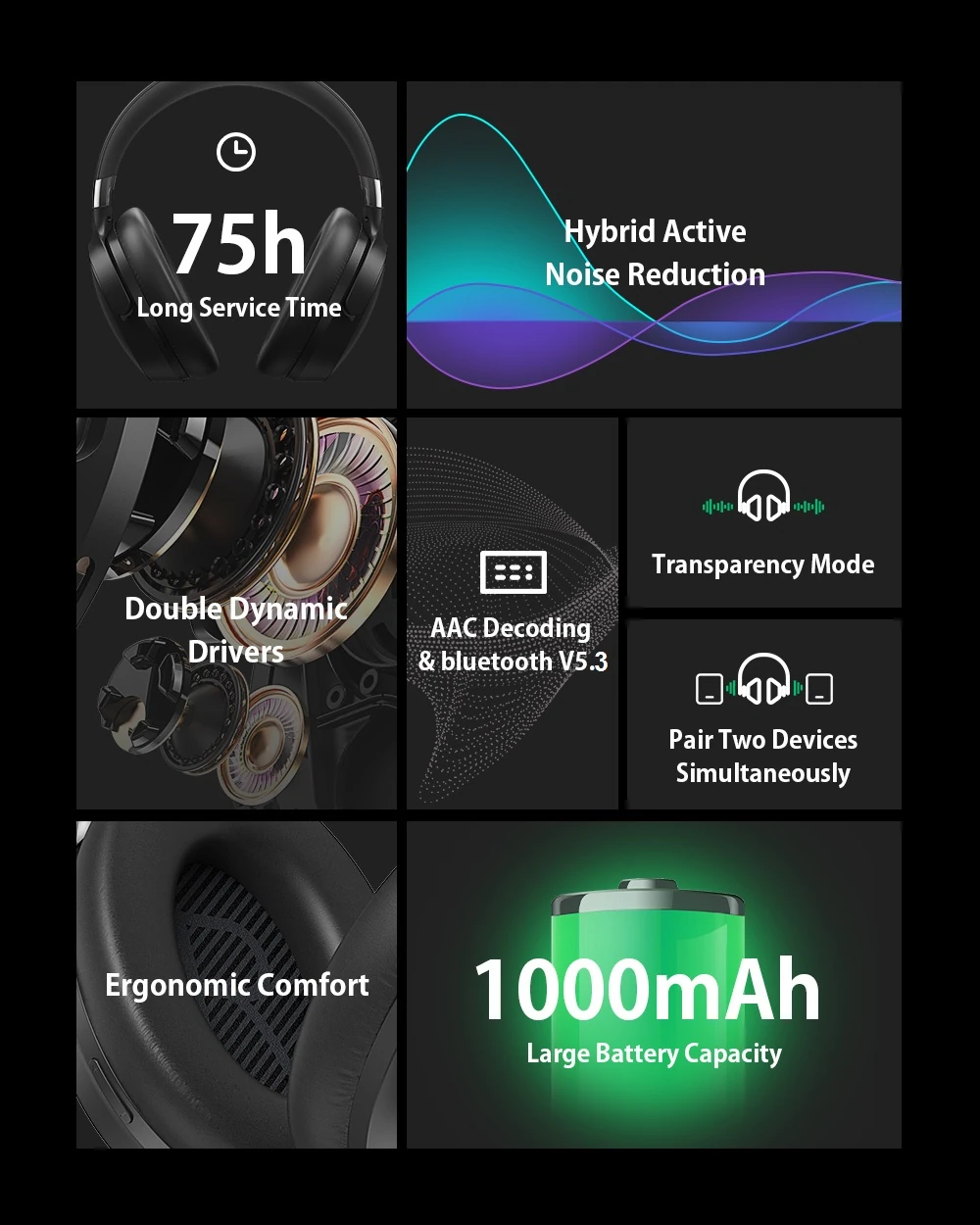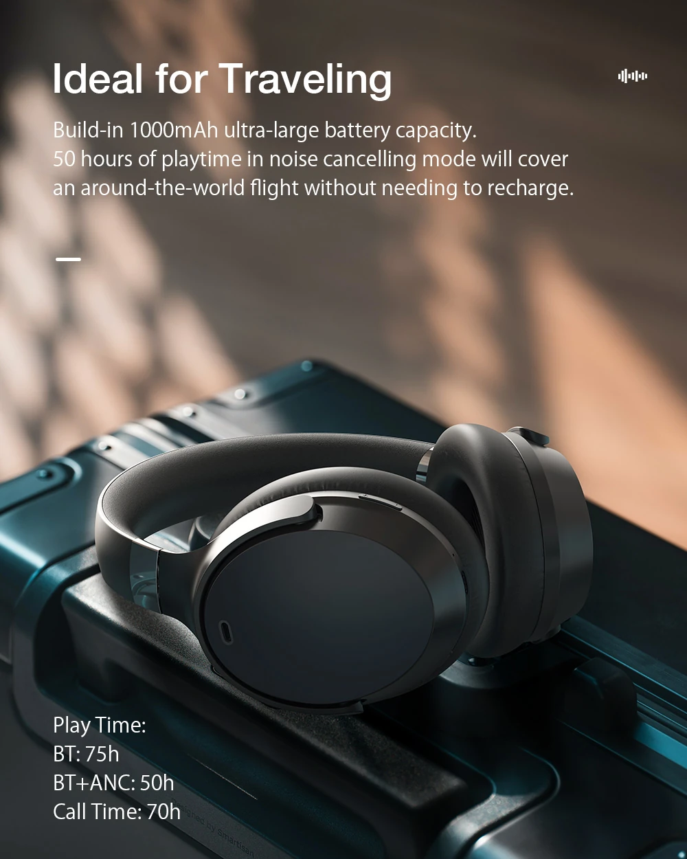 Mit dem integrierten, riesigen 1000-mAh-Akku lässt Sie der BW-HP5 Lite nie im Stich. Mit einer einzigen Ladung können Sie bis zu 50 Stunden Musik mit aktivierter Geräuschunterdrückung genießen. Diese Akkulaufzeit reicht für einen Weltflug, ohne zum Ladegerät greifen zu müssen.