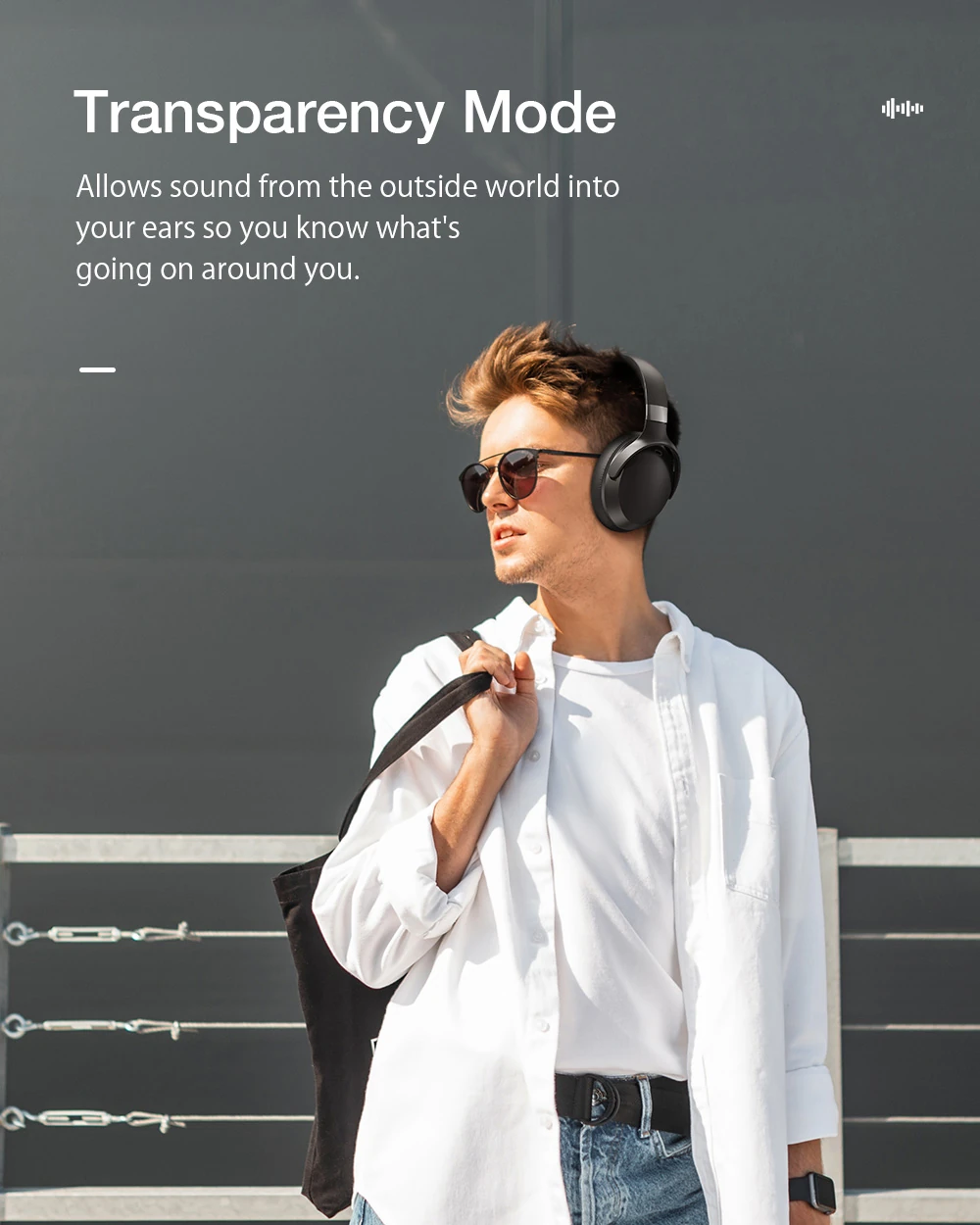Sie müssen Ihre Kopfhörer nicht abnehmen, um zu hören, was um Sie herum passiert. Mit einem einzigen Tastendruck aktivieren Sie den Transparenzmodus, der Außengeräusche durchlässt. So können Sie sicher durch die Straßen navigieren, wichtige Durchsagen am Flughafen hören oder sich mit einem Kollegen unterhalten, ohne Ihre Musik unterbrechen zu müssen.