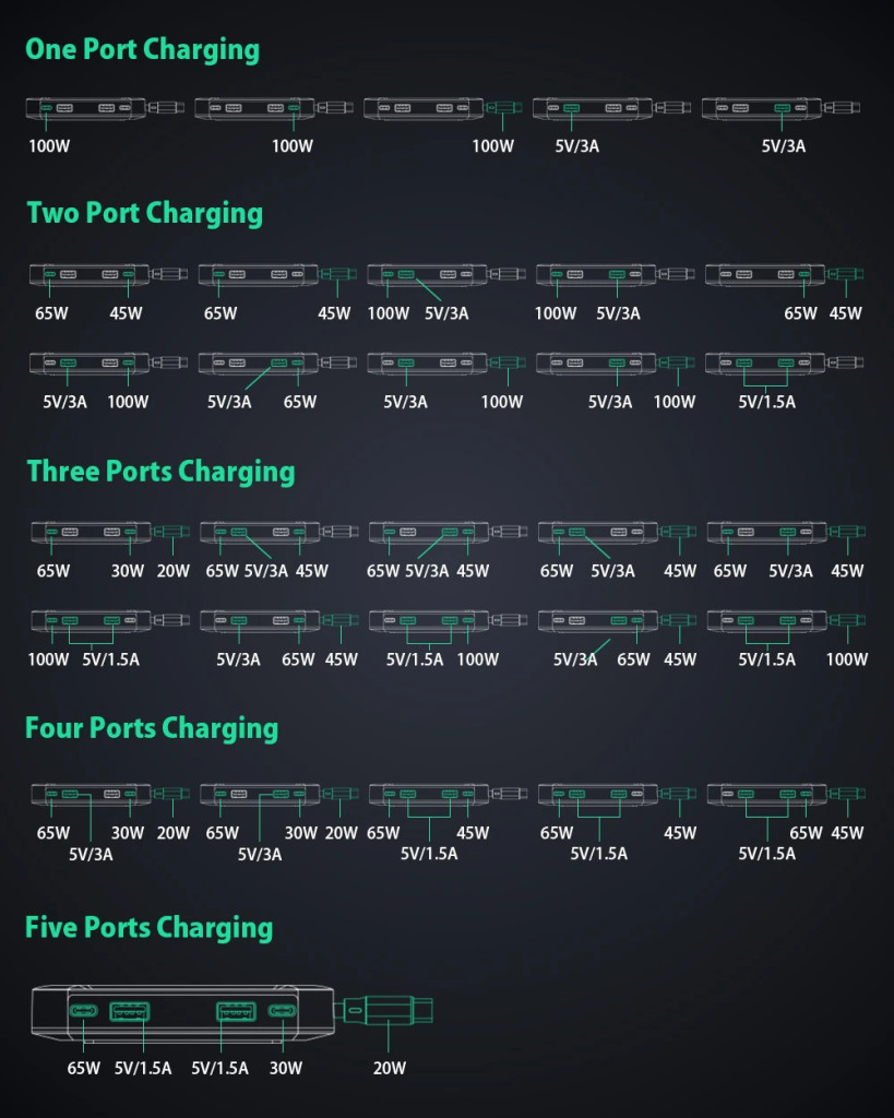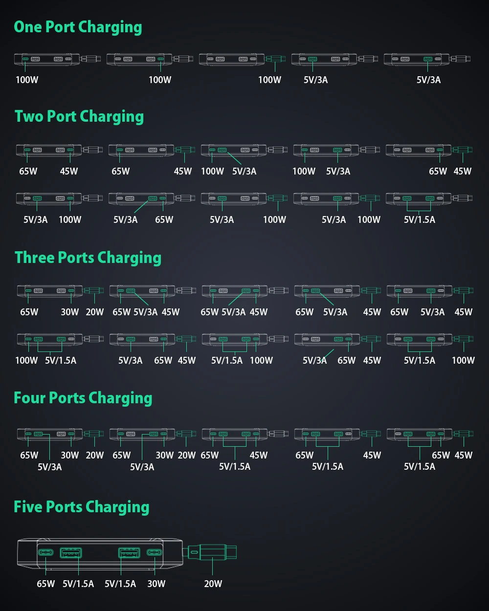 Wenn Sie alle Ports gleichzeitig nutzen, verteilt das Ladegerät die Ressourcen intelligent. Beispiel: USB-C-Ports liefern ca. 65 W und USB-A-Ports ca. 10 W bei gleichzeitiger Nutzung.