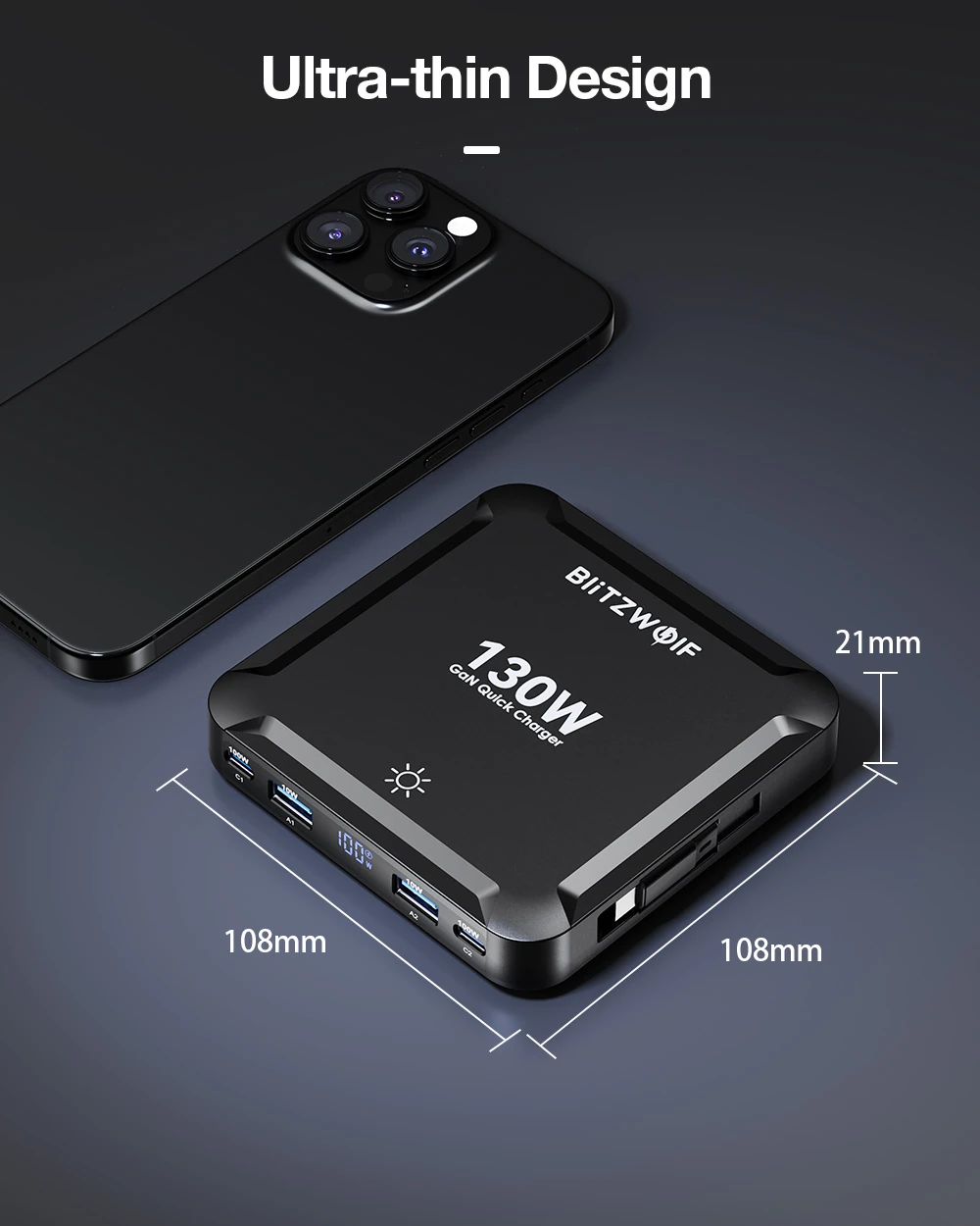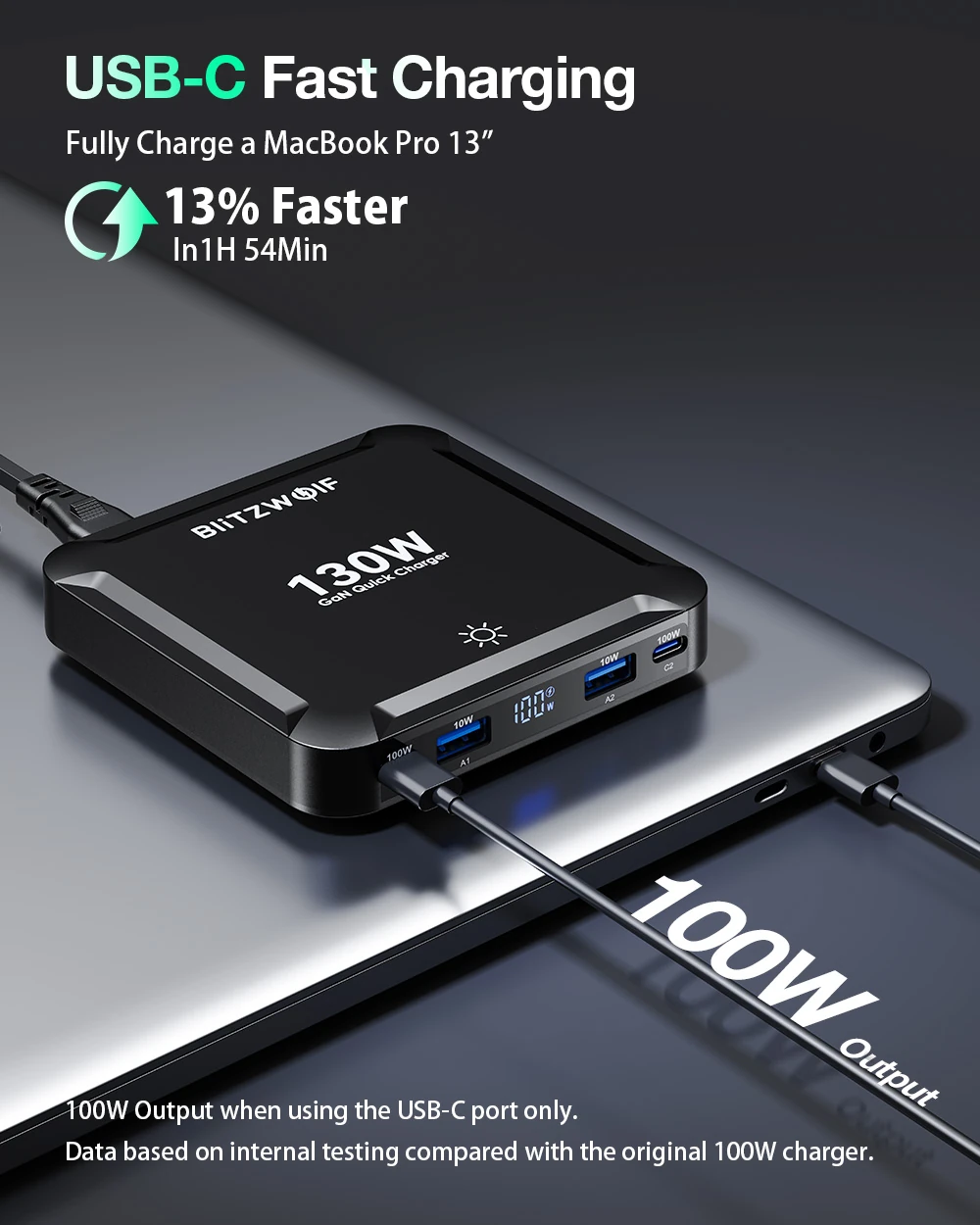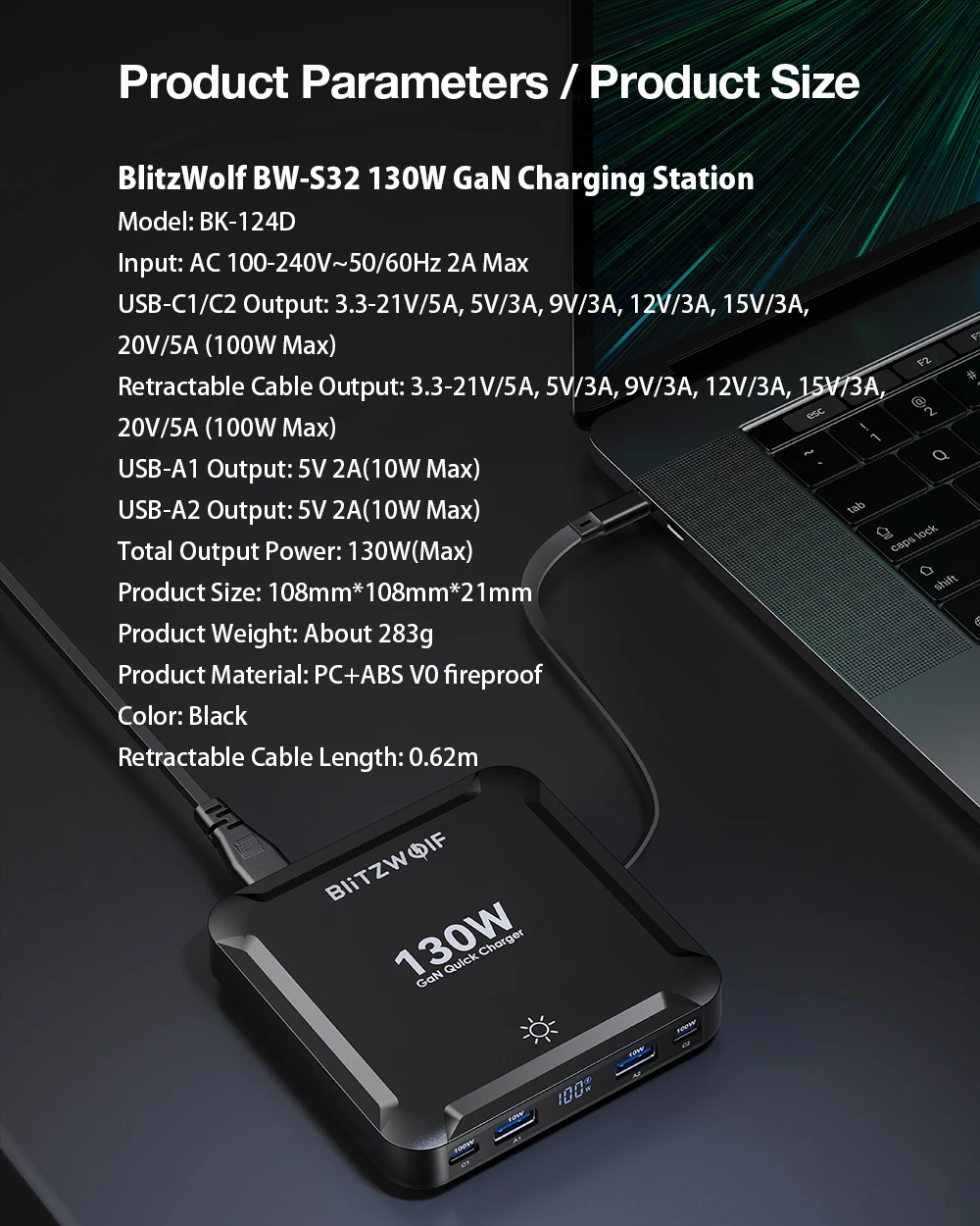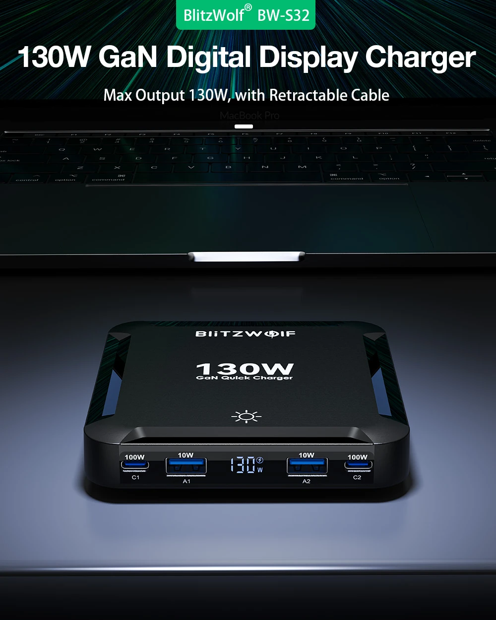 Hervorragende Leistung im kompakten Format: Der BW-S32 bietet eine Gesamtleistung von 130 Watt, die durch die fortschrittliche GaN-Technologie (Galliumnitrid) erreicht wird. Dank dieser Technologie ist das Ladegerät kleiner und leichter, arbeitet aber dennoch effizient und kühl, sodass Sie sich keine Sorgen um Überhitzung machen müssen.