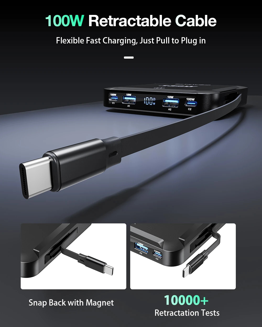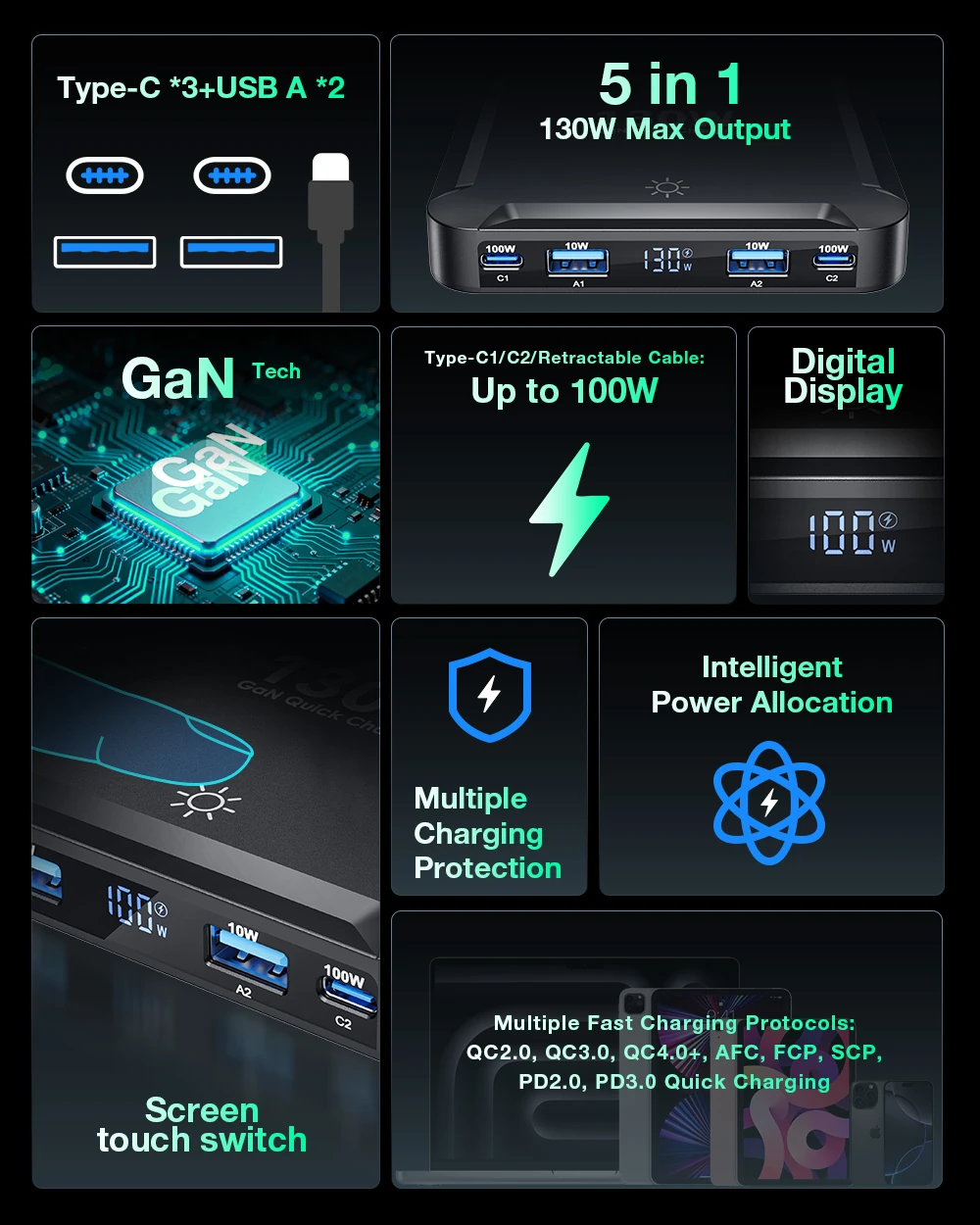 Laden Sie mehrere Geräte gleichzeitig: Dank fünf verschiedener Anschlüsse (2 USB-C und 2 USB-A sowie ein integriertes, einziehbares Kabel) können Sie mehrere Geräte gleichzeitig laden – egal ob Smartphone, Tablet, Laptop oder sogar Smartwatch und kabellose Kopfhörer.
