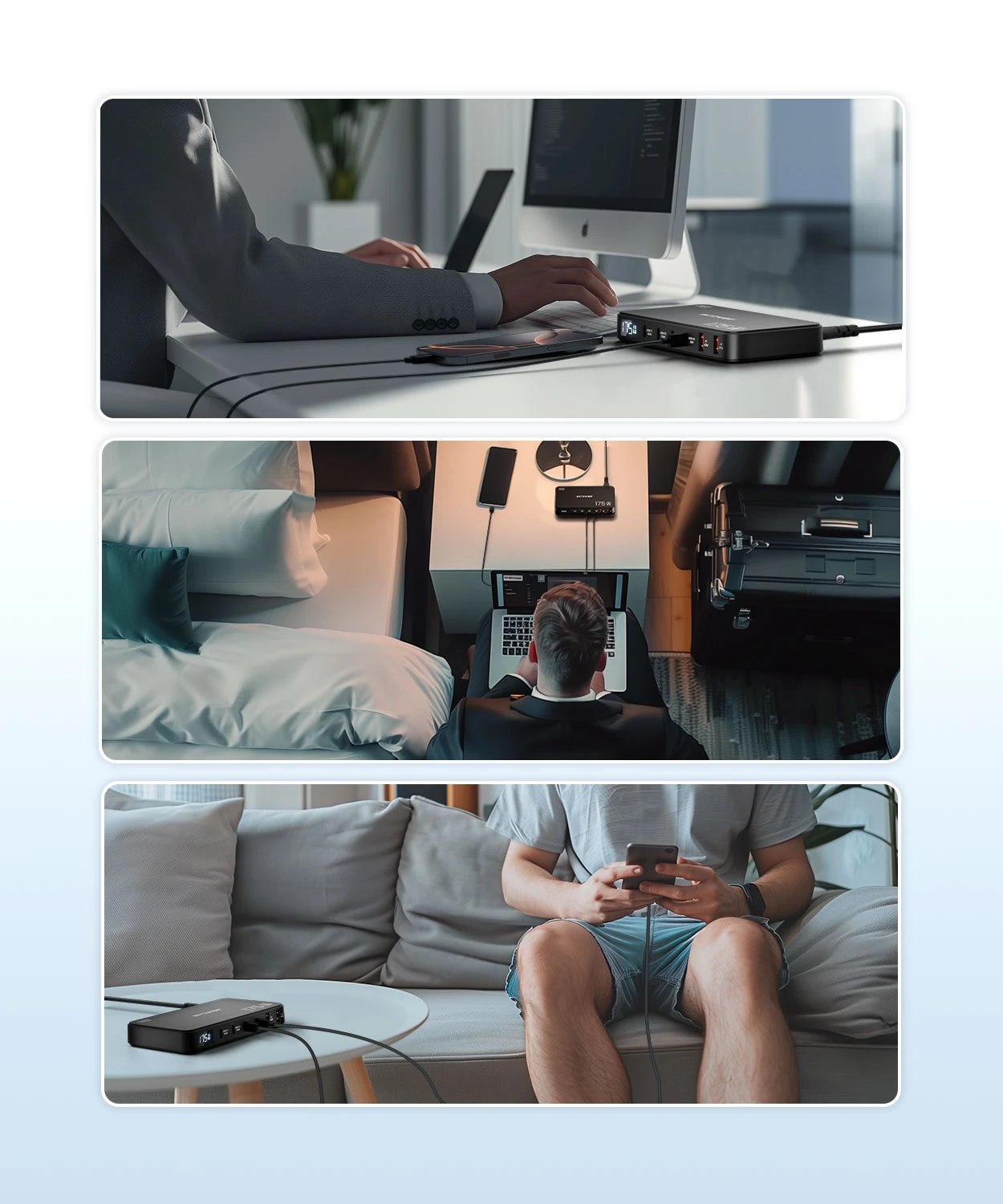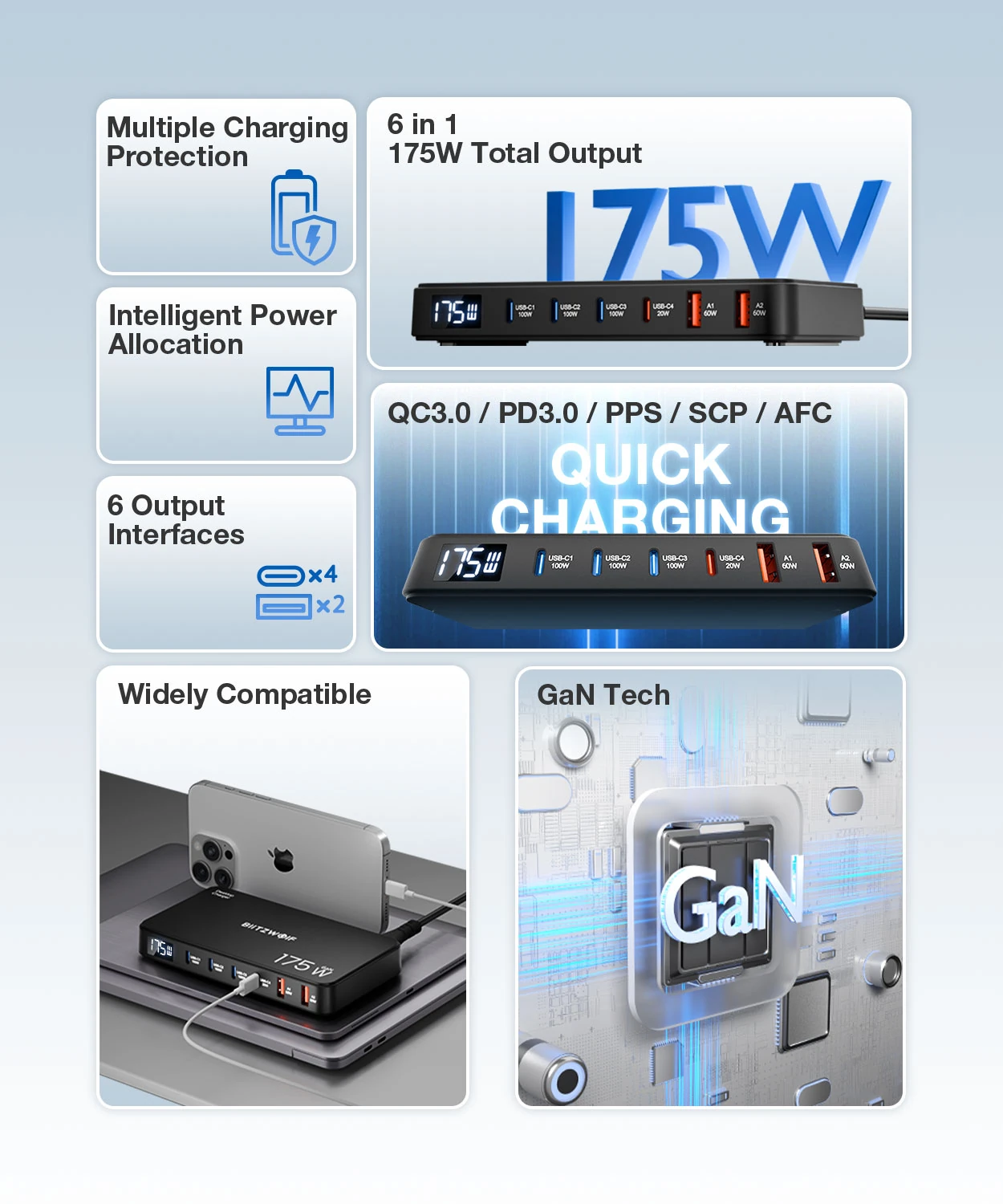 Dieses moderne 175W Ladegerät mit Galliumnitrid (GaN)-Technologie vereint Geschwindigkeit, Sicherheit und Vielseitigkeit in einem kompakten Gerät. Es ist die perfekte Wahl für Zuhause und im Büro, wo mehrere Geräte – ob Apple, Windows oder Android – gleichzeitig, schnell und effizient geladen werden müssen und nur wenig Platz auf dem Schreibtisch zur Verfügung steht.