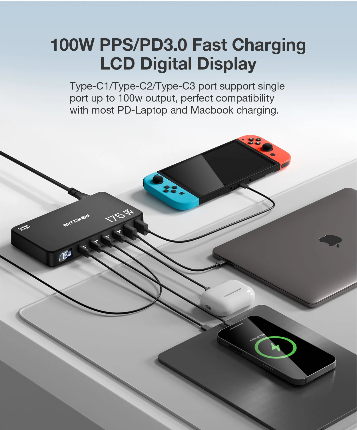 175W Maximalleistung: Die Ladestation liefert bis zu 100 W über den USB-C-Anschluss und ist damit ideal zum Schnellladen von Laptops (z. B. MacBook Pro/Air), Tablets und den neuesten Smartphones.