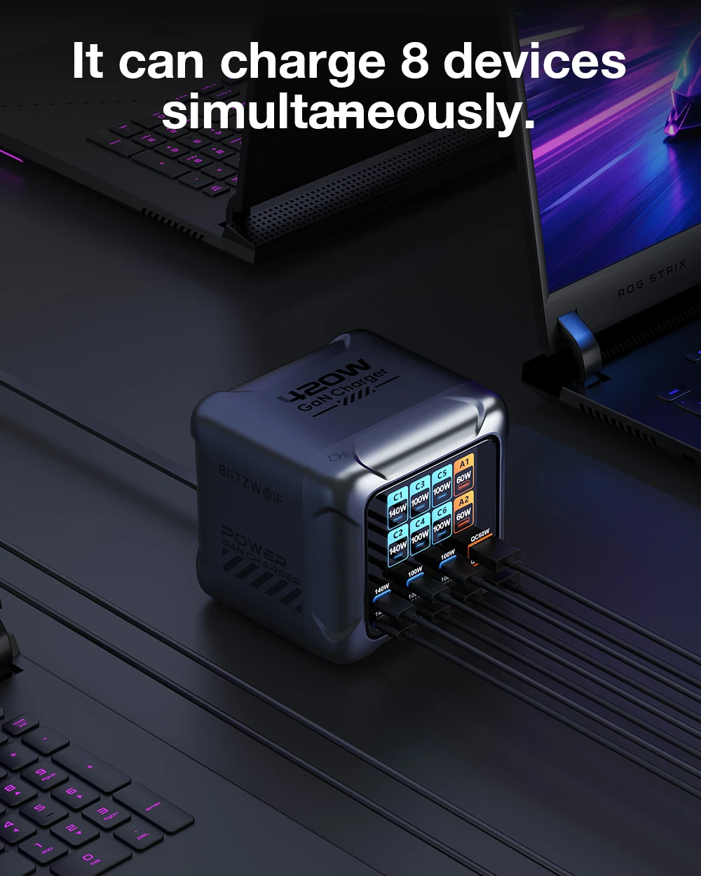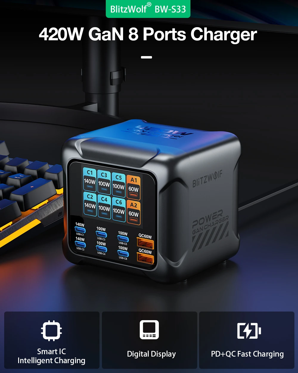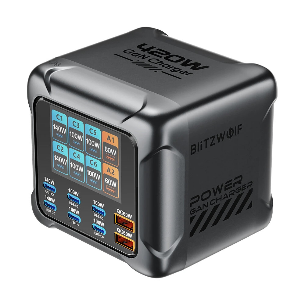 Entdecken Sie die Blitzwolf® BW-S33 420W 8-Port USB PD Ladestation – die perfekte Lösung für schnelles und sicheres Laden all Ihrer Geräte! Dieses kompakte und dennoch leistungsstarke Desktop-Ladegerät verfügt über 6 USB-C- und 2 USB-A-Anschlüsse, mit denen Sie bis zu acht Geräte gleichzeitig laden können. Das digitale Display zeigt den Ladezustand präzise an, sodass Sie Ihre Stromversorgung stets im Blick haben.