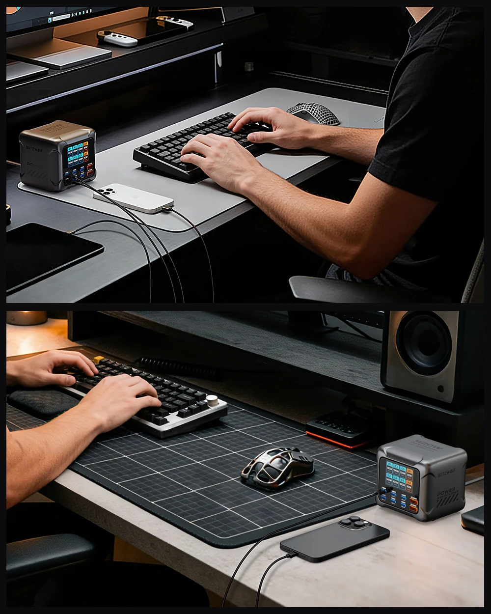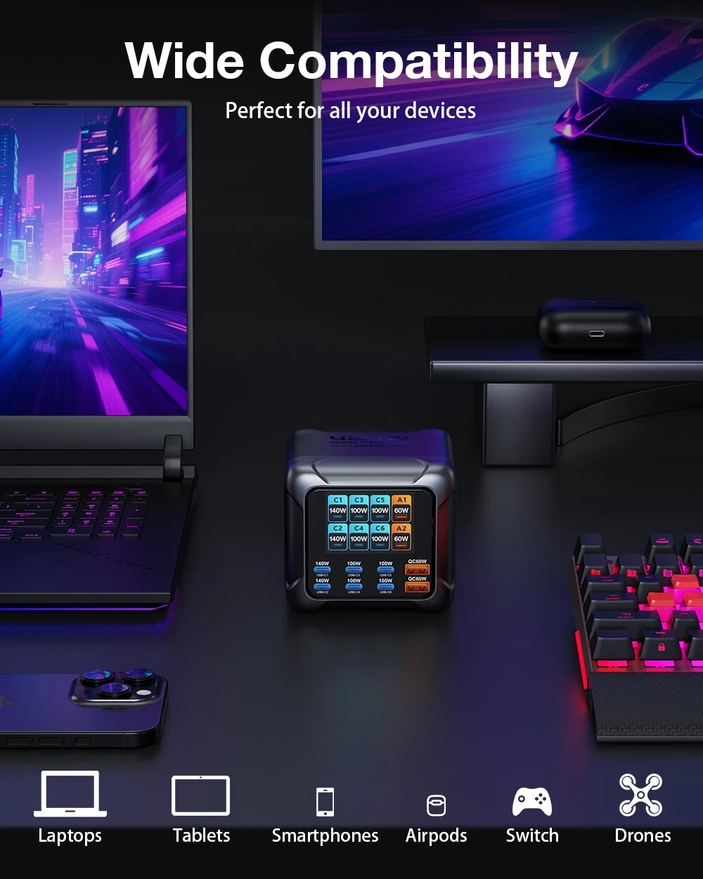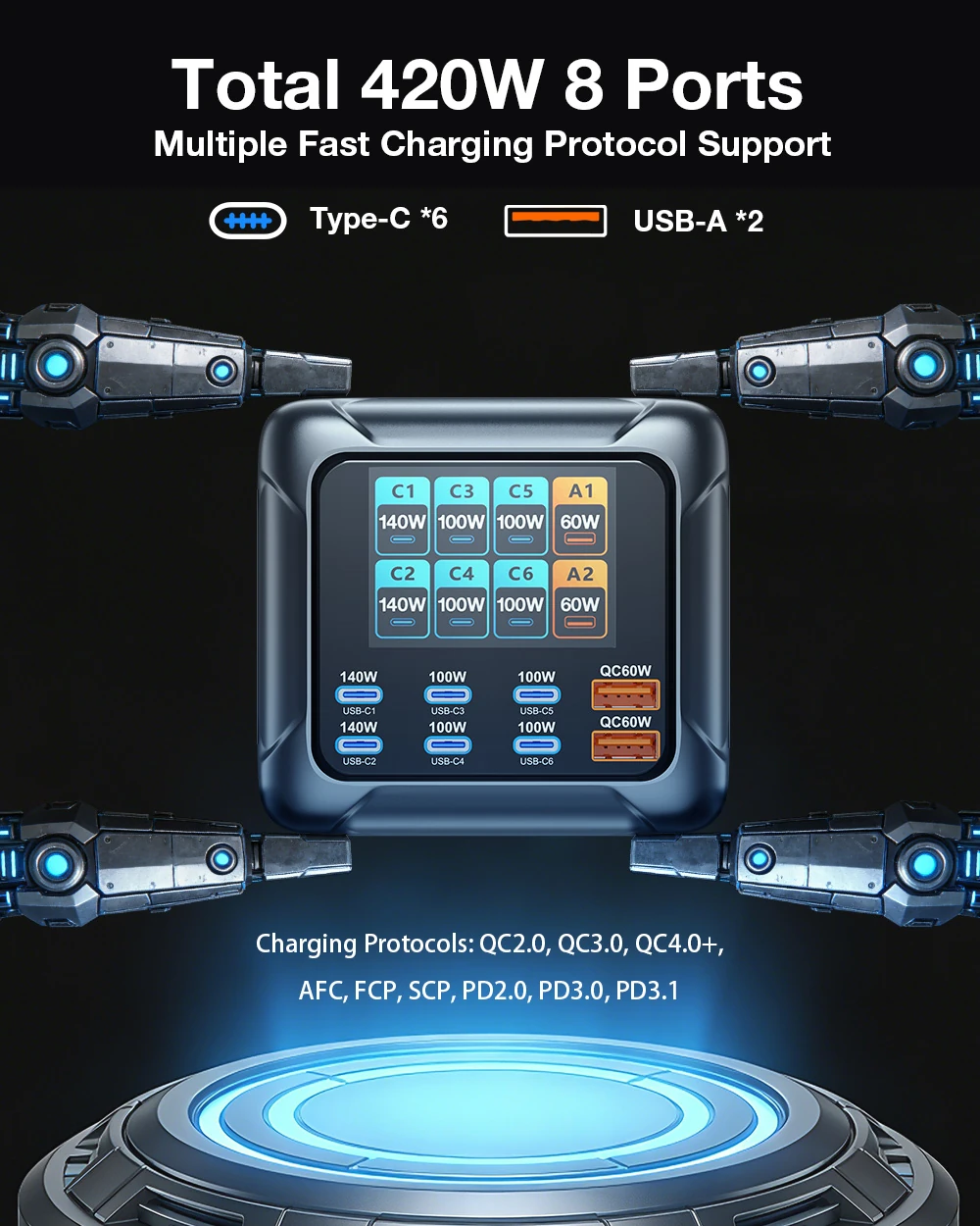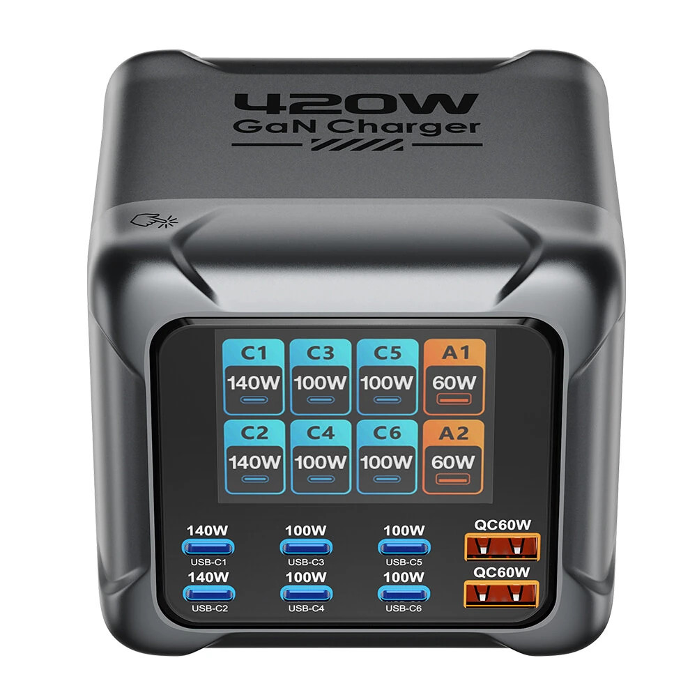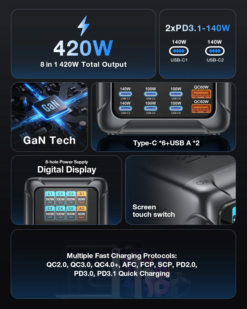 420W Gesamtleistung – stark genug, um Laptop, Smartphone, Tablet und mehr gleichzeitig zu laden.