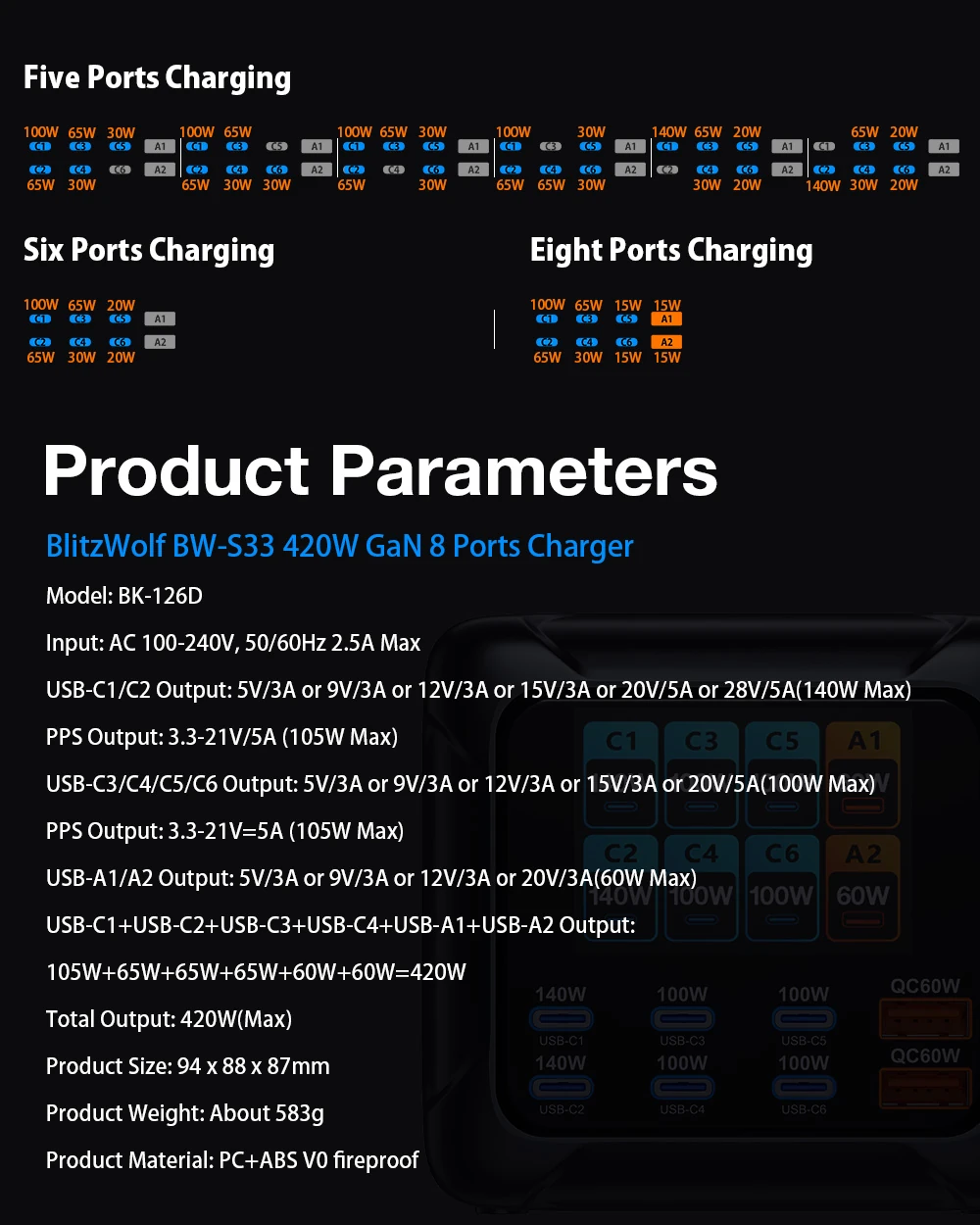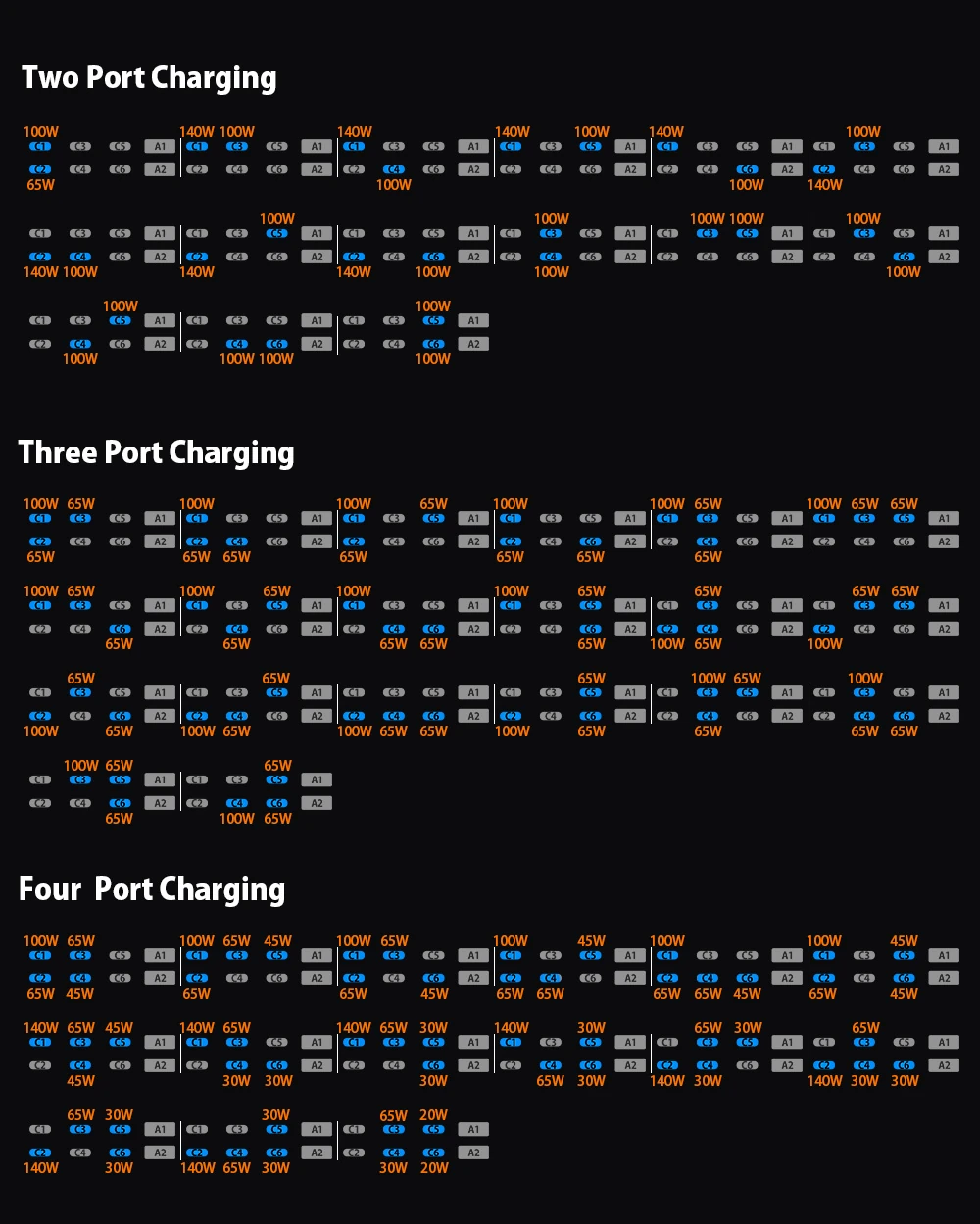 USB-C1 + USB-C2 + USB-C3 + USB-C4 + USB-A1 + USB-A2: 420 W