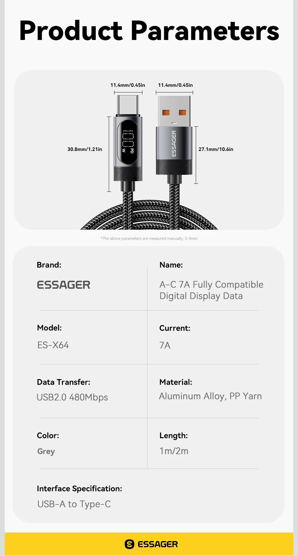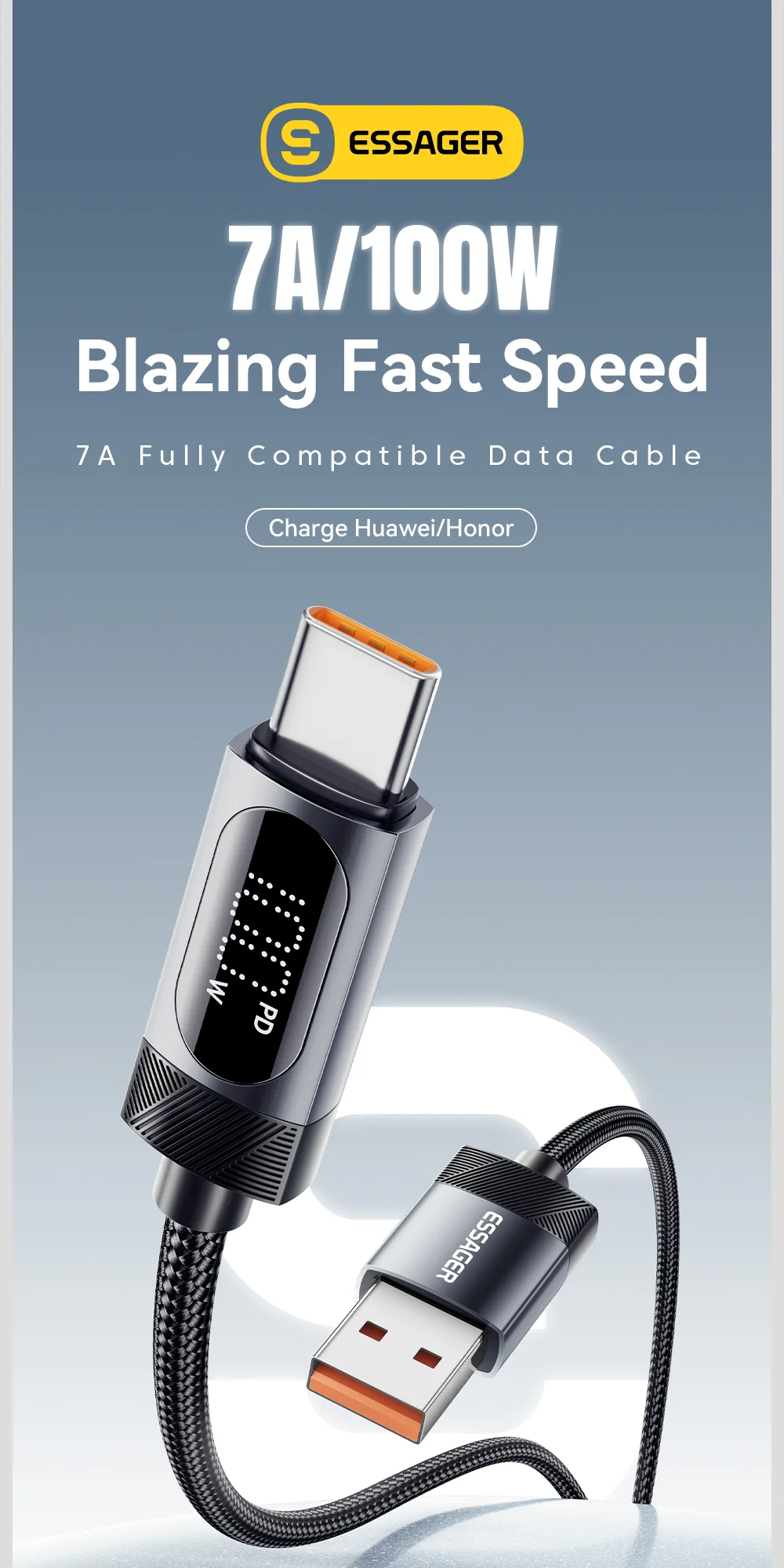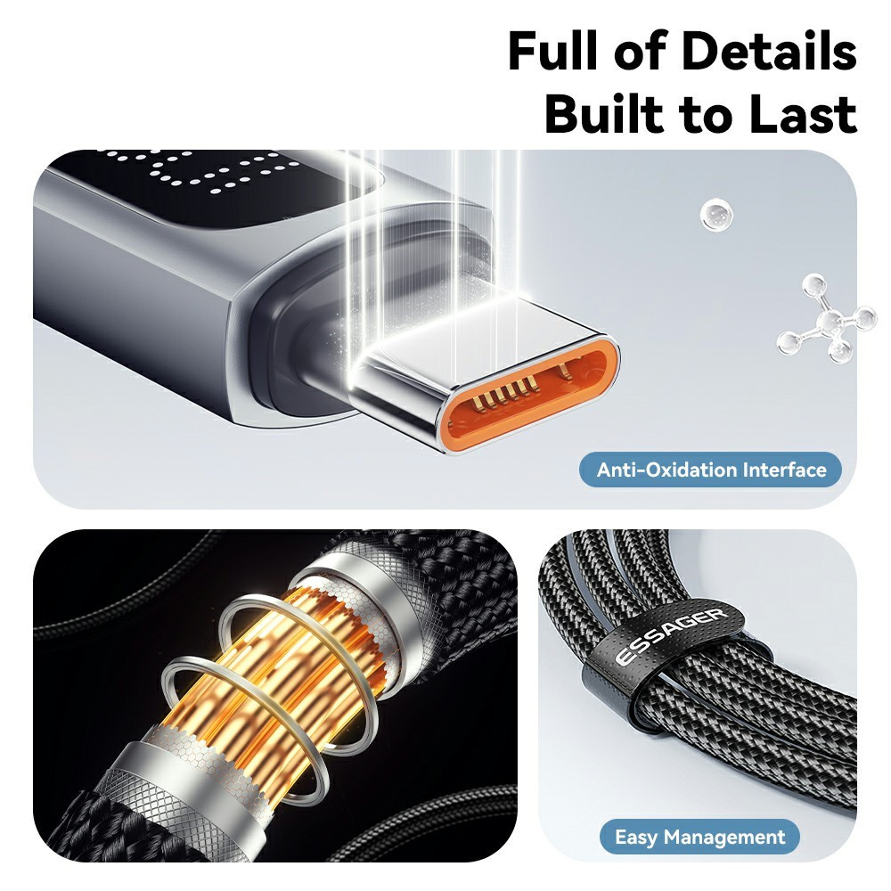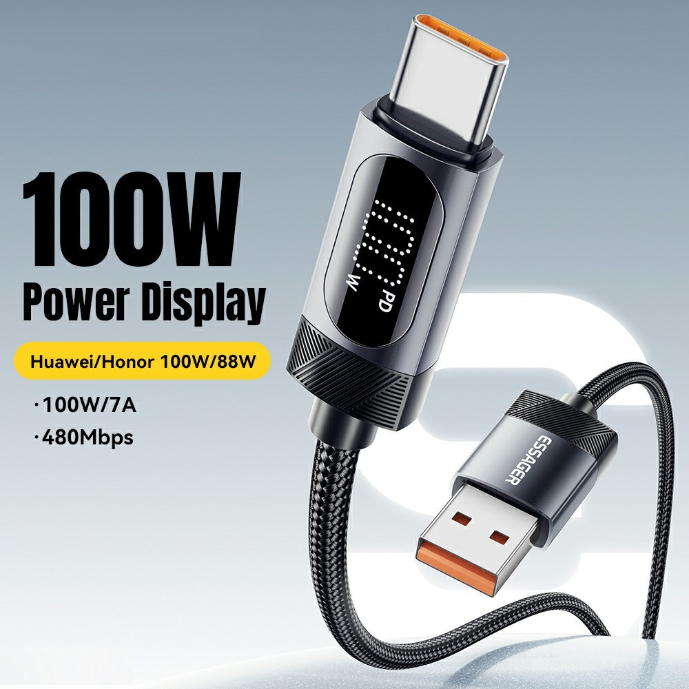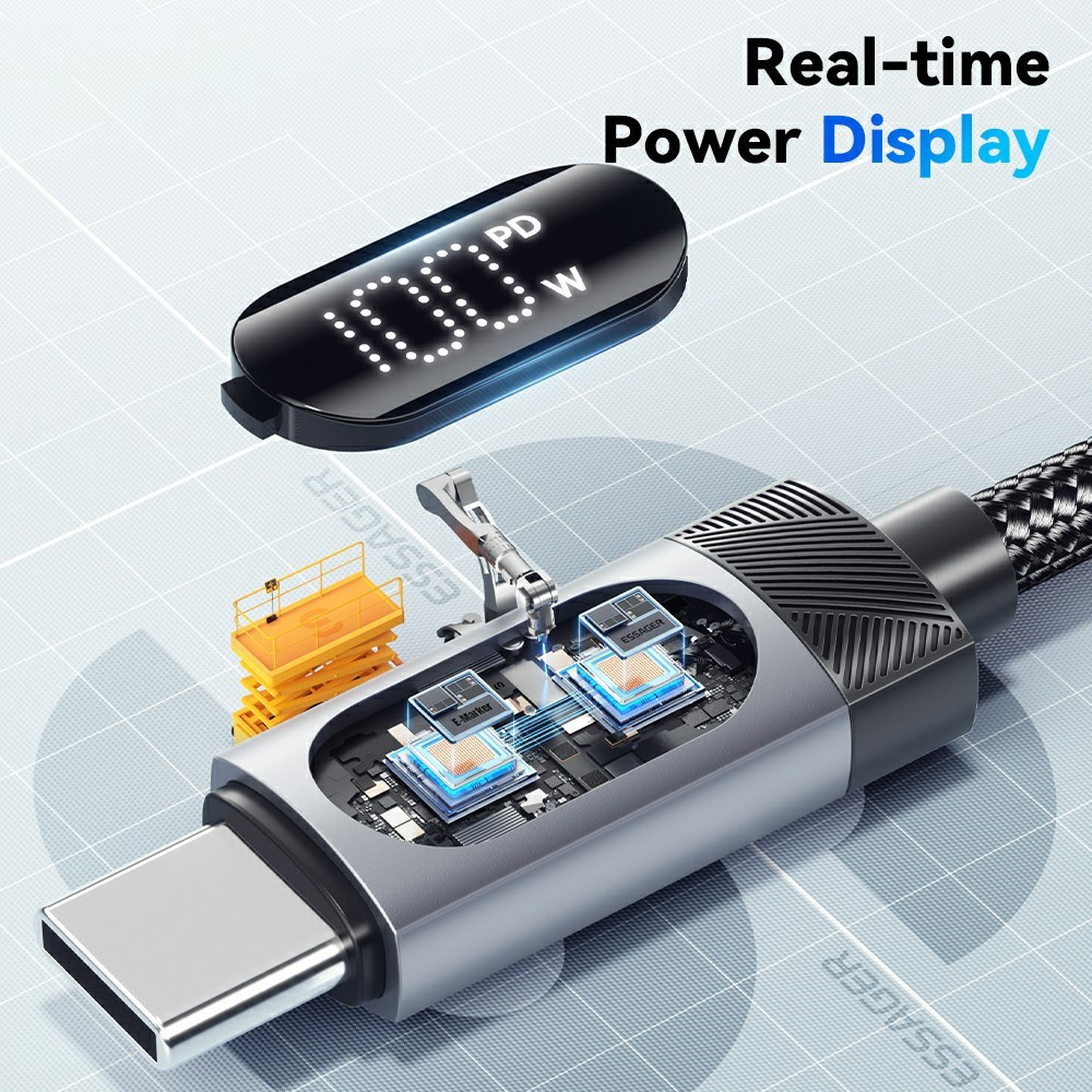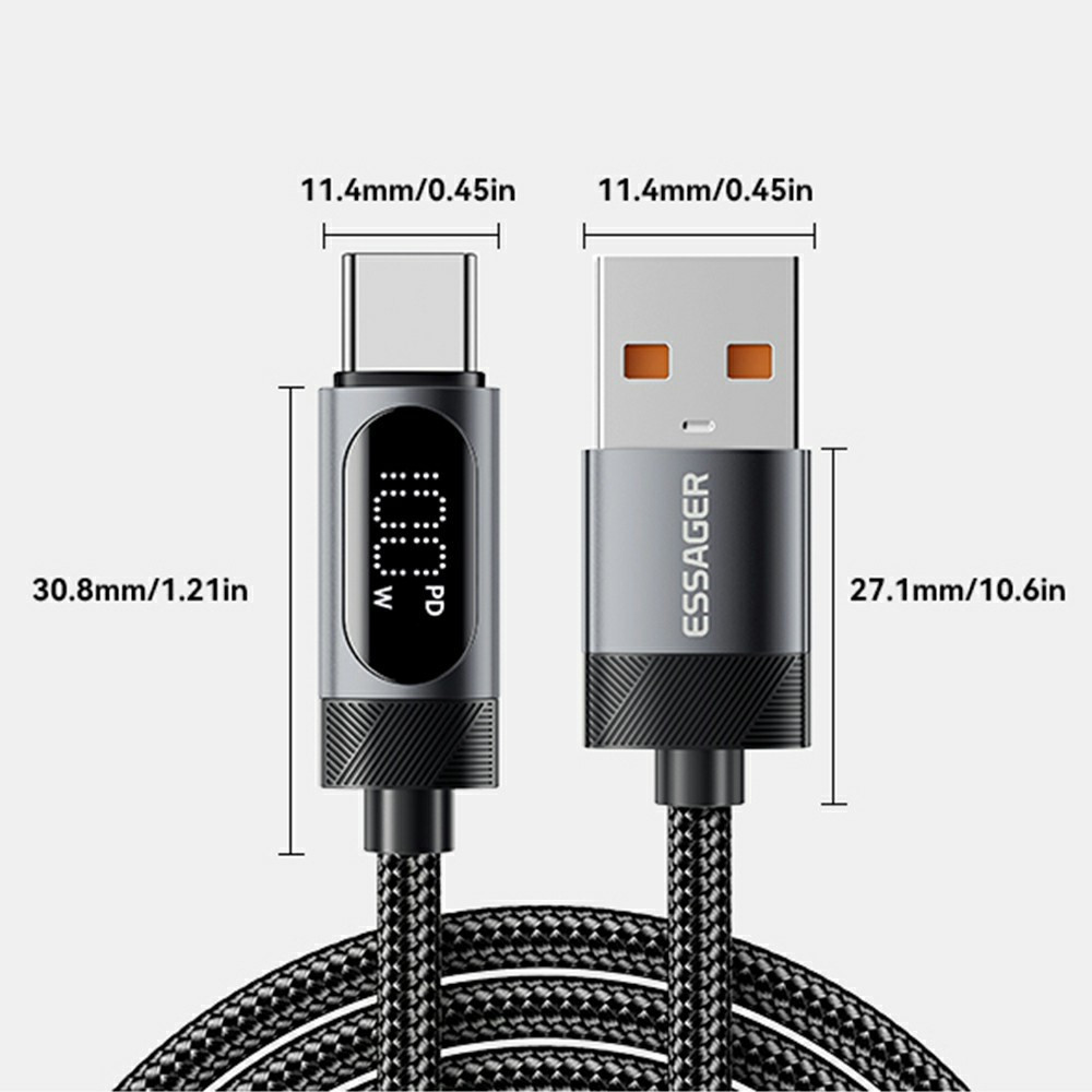 ESSAGER ES-X64 – 1 Meter langes Type-A - Type-C Kabel. Digitalanzeige, 100-W-Ladefunktion, Perlmuttstoffbezug