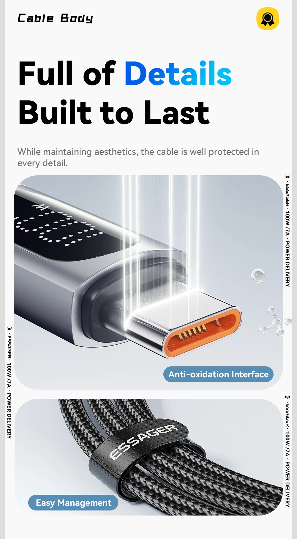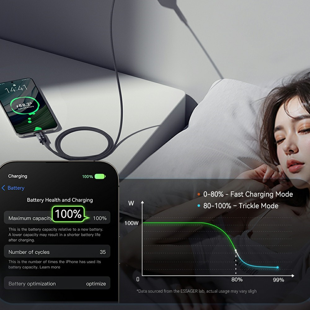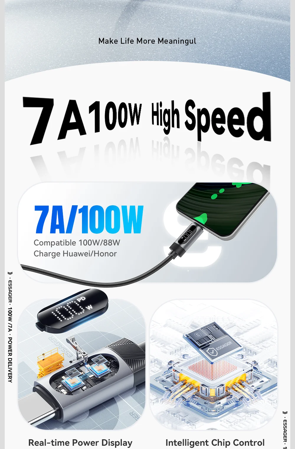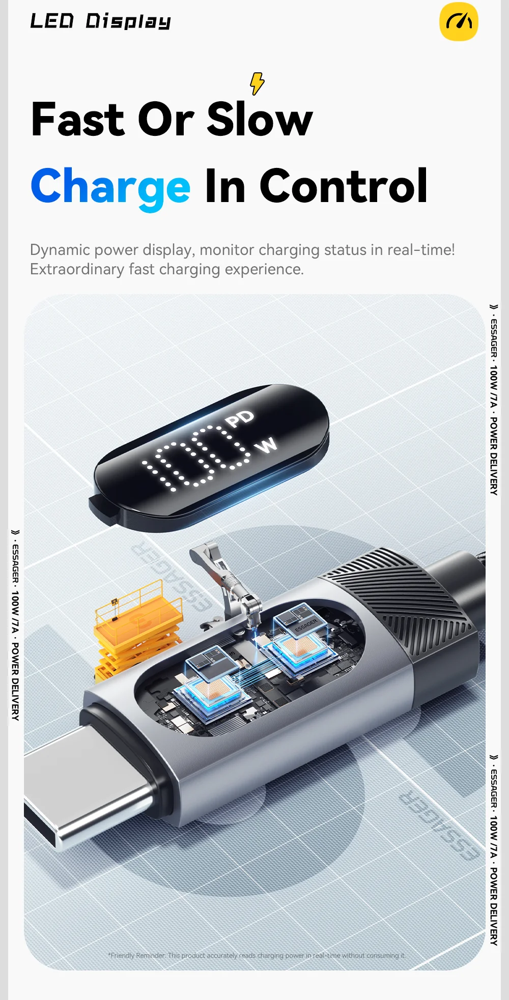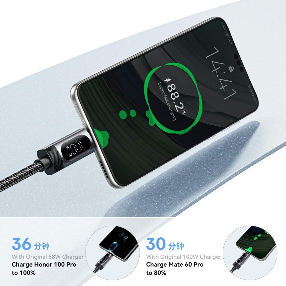 ESSAGER ES-X64 – 1 Meter langes Type-A - Type-C Kabel. Digitalanzeige, 100-W-Ladefunktion, Perlmuttstoffbezug