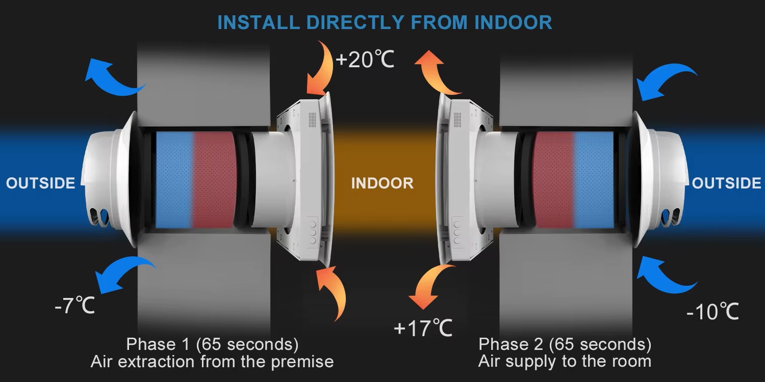 Der Keramik-Wärmetauscher überträgt die Wärmeenergie der Abluft auf die einströmende Frischluft, sodass der Großteil der Heizenergie des Raumes (90 %) erhalten bleibt und beim Lüften keine Wärme verloren geht. Dieses Verfahren beugt Schimmelbildung und Fäulnis vor und sorgt für ein gesundes Raumklima.