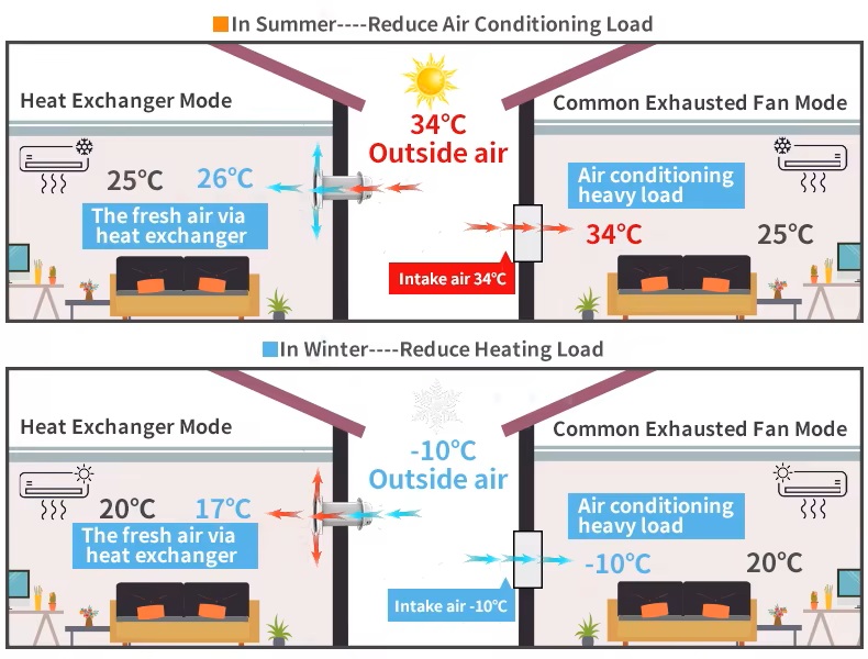 - Drei Lüftungsmodi: Frischluftmodus, Abluftmodus und zyklischer Modus, die bequem per Fernbedienung oder App umgeschaltet werden können.