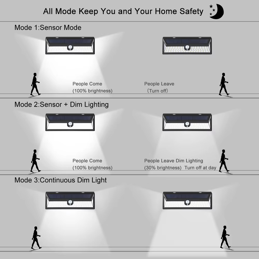 - Modus 3 (Dauerlicht): Leuchtet die ganze Nacht mit konstanter, mittlerer Helligkeit und reagiert nicht auf Bewegung.