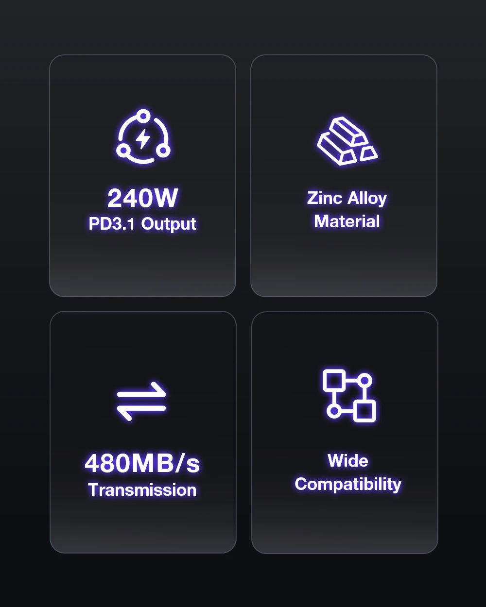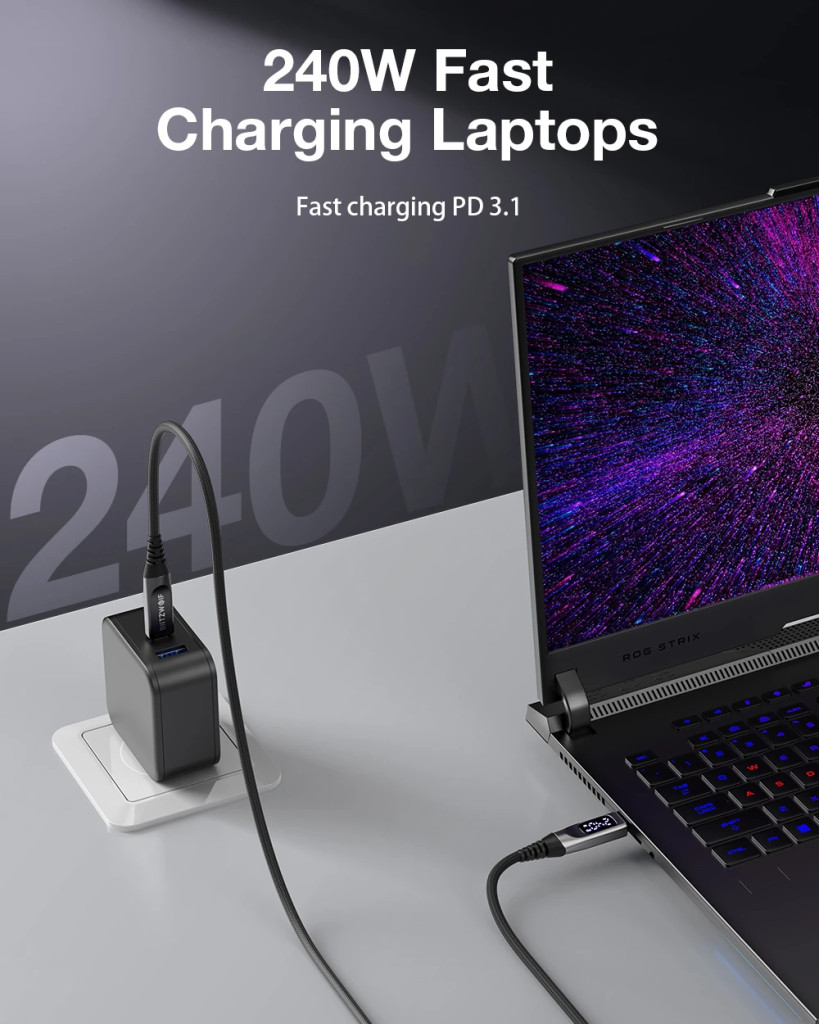 Extremes 240W PD3.1 Schnellladen: Mit der Unterstützung des neuen PD3.1-Protokolls kann das Kabel bis zu 240W Leistung übertragen. Das bedeutet, dass Sie nicht nur Smartphones, sondern auch die anspruchsvollsten Gaming-Laptops und Tablets mit maximaler Geschwindigkeit aufladen können.